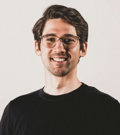 An iPad displaying a website with a blue-themed crash course advertisement, featuring a person in a blue shirt prominently. Beside the iPad lies a dark-colored coffee mug on a wooden coaster, all against a black background.
